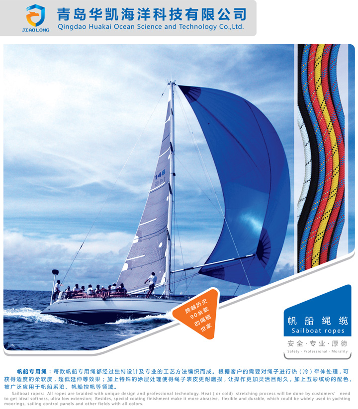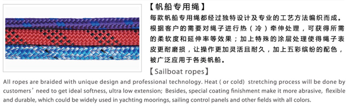 帆船專用繩:每款帆船用繩都經過獨特設計及專業的工藝方法編織而成,根據客戶的需要對繩子進行冷(熱)牽伸處理,可獲得所需的柔軟度和延伸率的效果;加上特殊的涂層處理使得繩子表面更耐磨損,讓操作更加靈活且耐久,加上五彩繽紛的配色,被廣泛應用于各類帆船。